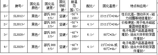上表中的SL3029黑色灌封膠的耐溫短時(shí)間,可以到200度長期,短時(shí)間能耐溫到250度,而且可以常溫或中溫固化,這在灌封膠中不多見,很有特色。